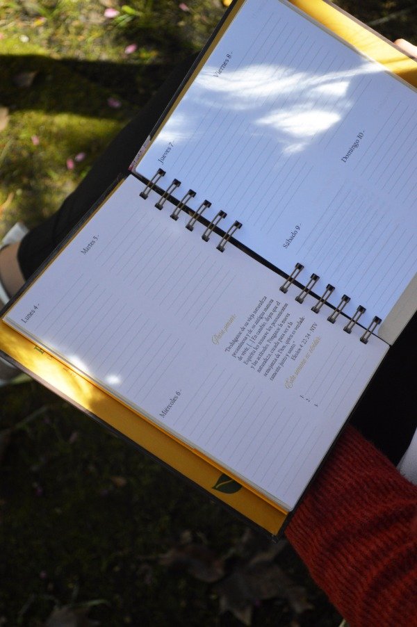 🌺 Anotaciones, con hojas rayadas y versículo bíblico al pie de página.
